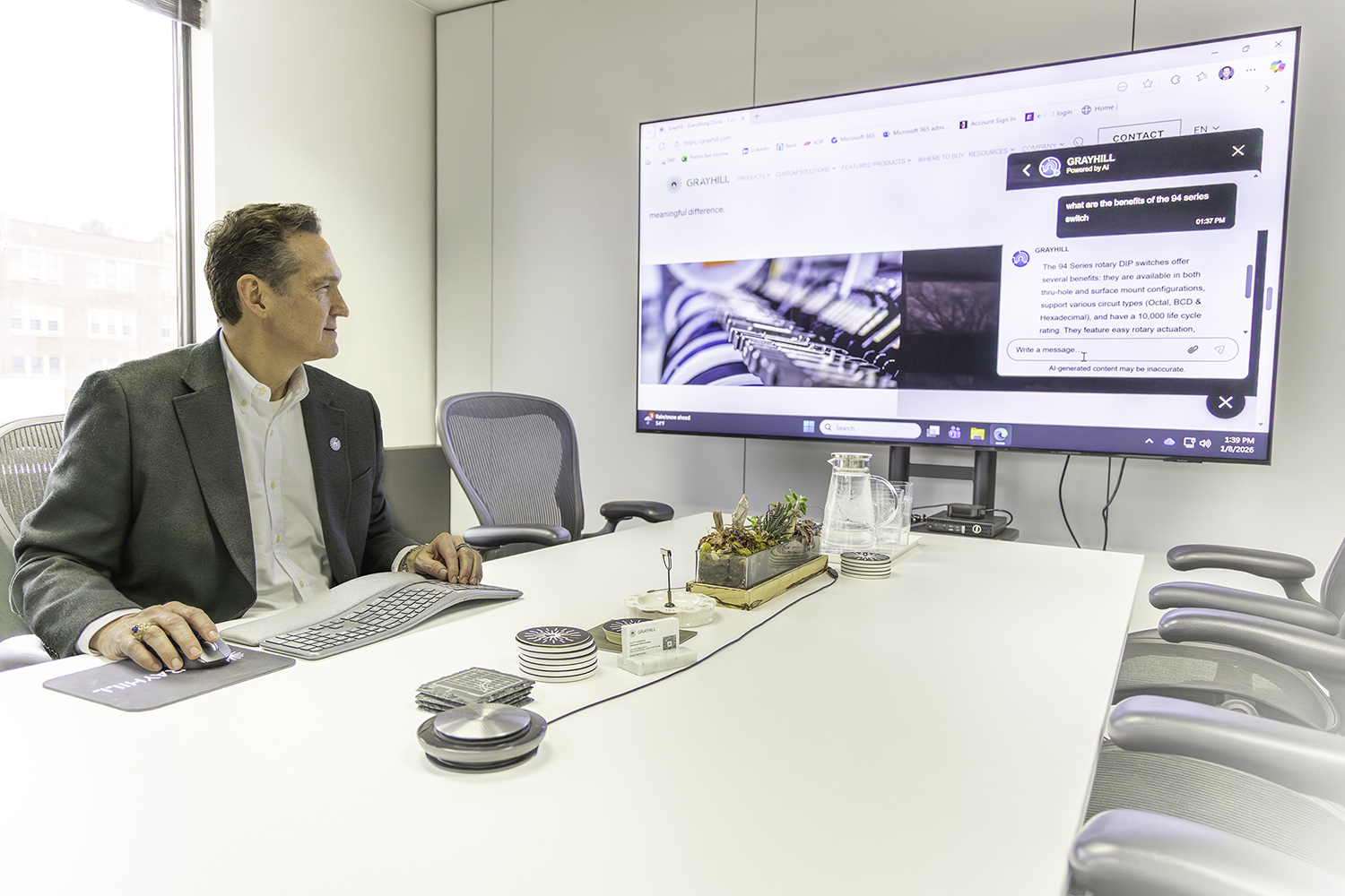 Grayhill CEO & President Scott Harrison demonstrates the company’s AI-powered website chat agent designed to support engineers and global customers.